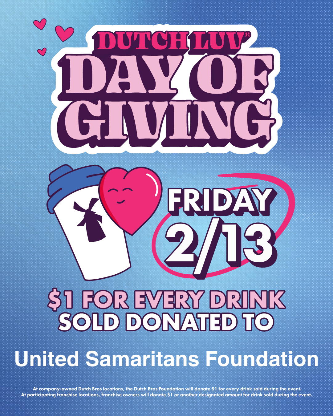Feb 13 5:00 AM05:00 Dutch Luv Day of Giving Friday, February 13, 2026 5:00 AM 11:00 PM 05:00 23:00 Dutch Bros Coffee (map) Google Calendar ICS View Event →